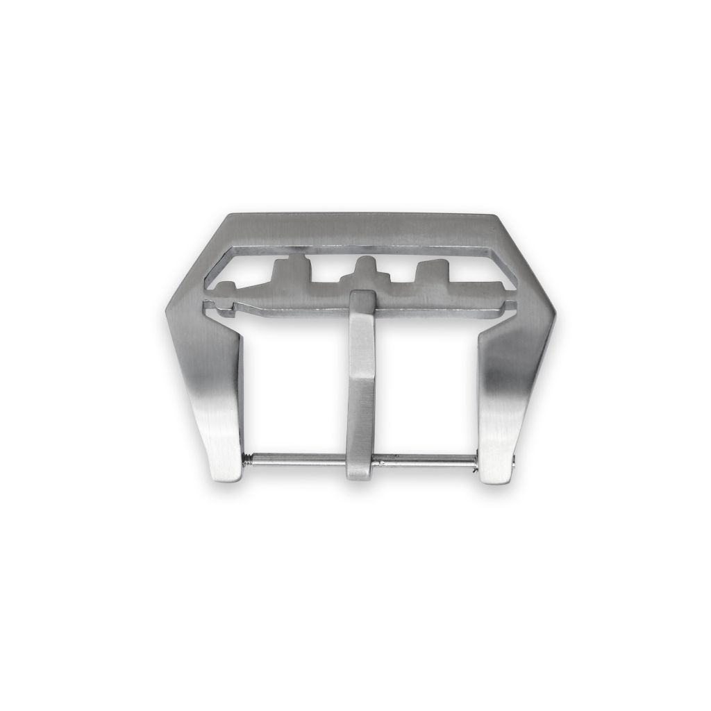 This surgical steel buckle was developed in tribute to the Hubert commando unit. It represents a stylised submarine propeller.