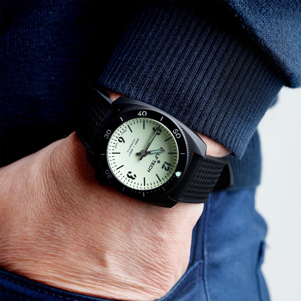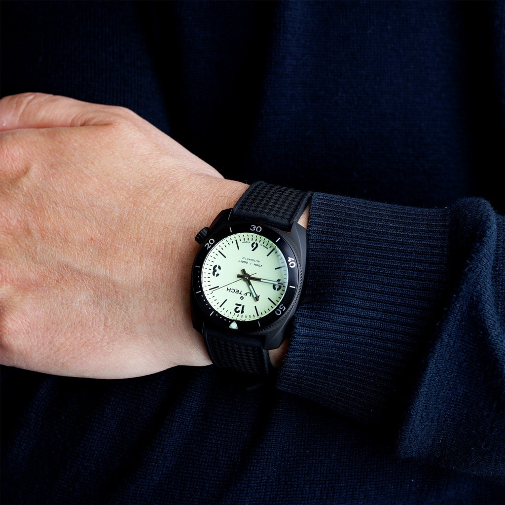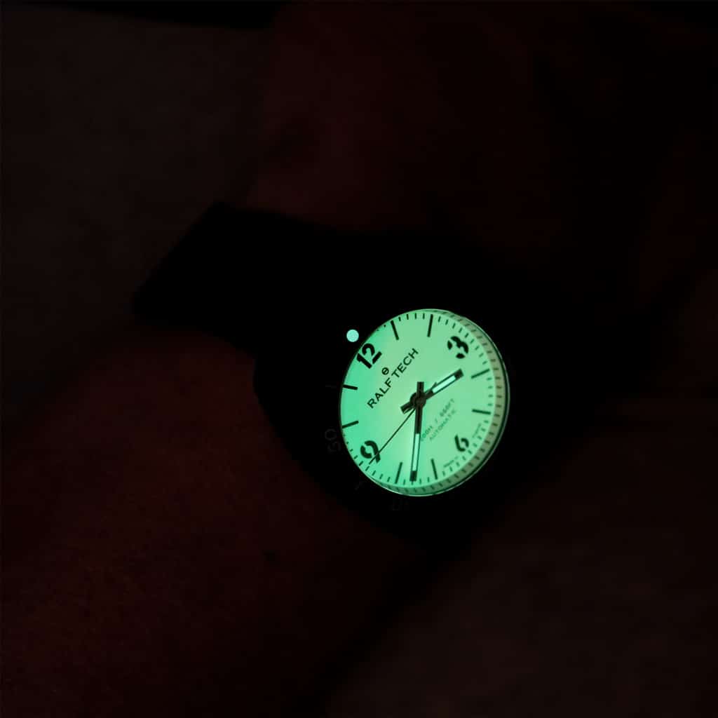 The WRB is the most versatile of the RALF TECH diver’s models. Less imposing than its cousin the WRV it retains its spirit, the main characteristics and functions. Its diameter of 39mm will suit all wrists. This contrasted black “Full Lume” version is both original and incredibly luminescent. And it’s an ultra-limited version!
